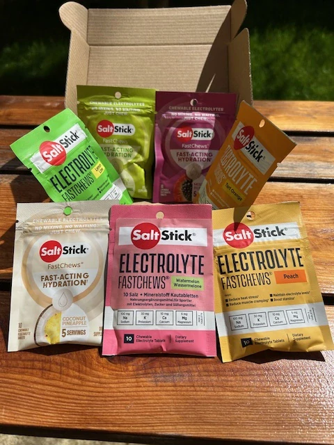 - Pastilky navržené tak, aby obsahovaly elektrolyty ztracené potem (sodík, draslík, vápník a hořčík)